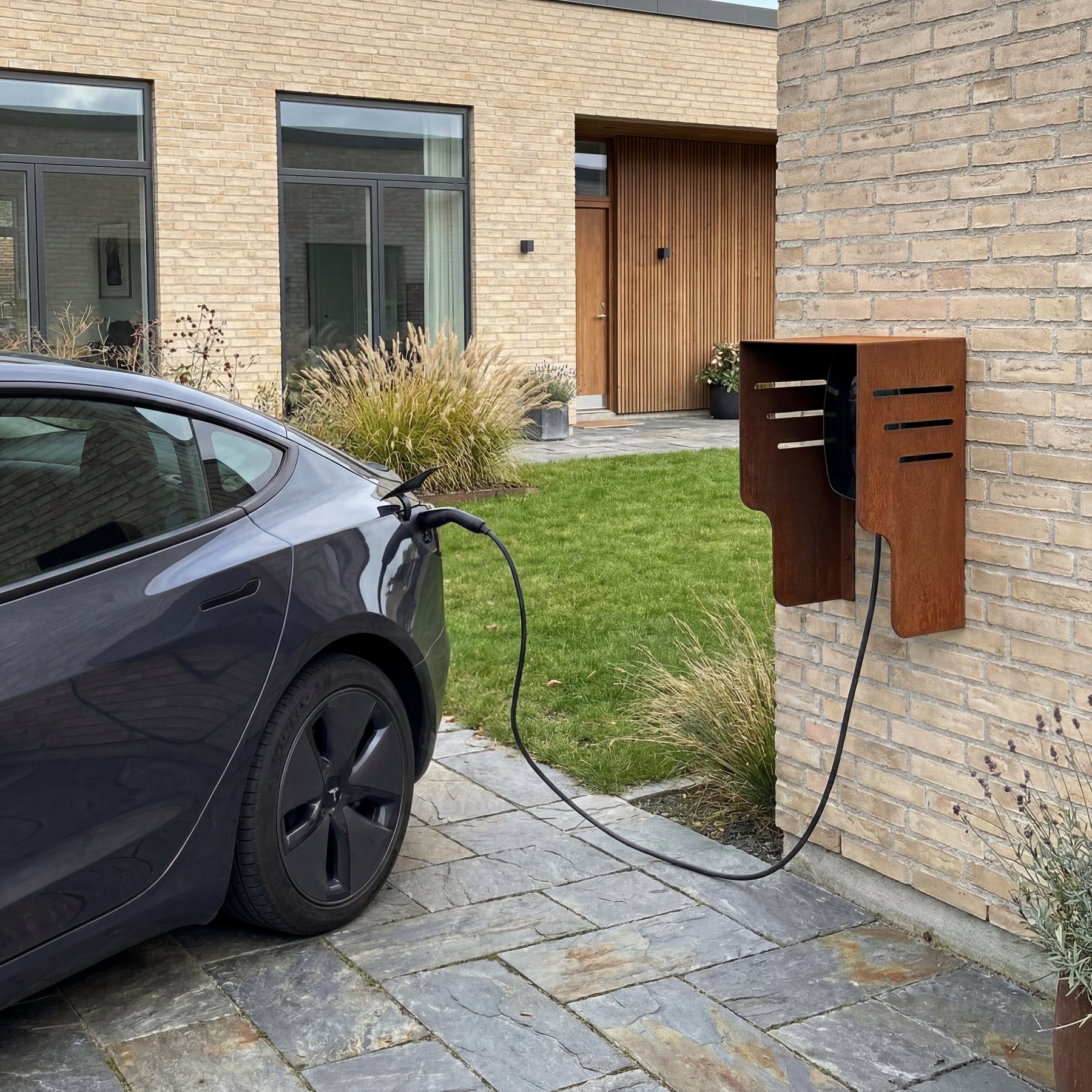 Suchen Sie nach einem Schutz, der sich mit den Jahren organisch verändert? Unser Wallbox-Wetterschutz aus Cortenstahl ist die ideale Wahl für alle, die das rohe, natürliche Material schätzen. Cortenstahl bildet unter dem Einfluss der Witterung eine dichte Rostschicht, die den Stahlkern dauerhaft schützt.